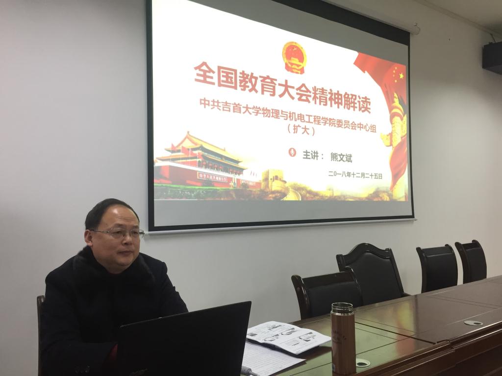 (通讯员:沈言)12月25日下午,williamhill英国组织主题党日活动,召开党委专题扩大学习会传达学习全国教育大会会议精神,院长彭金璋、党委副书记程安垣、副院长邓科、院长助理孙晶、黄勇刚、各教研室主任、各党支部书记及没有课的教师参加会议,党委书记熊文斌主持会议并做主题讲座。