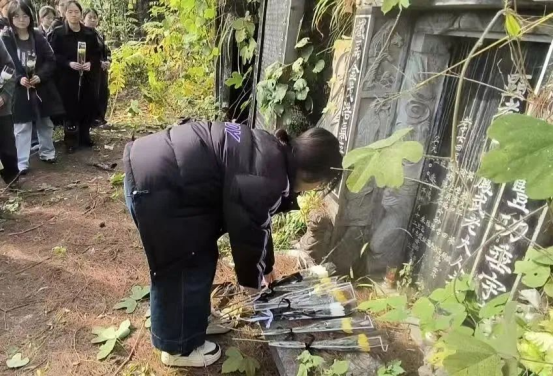 随后,学生党员怀着对革命先辈的敬仰之情,开始描红。大家神情专注,用蘸着象征革命胜利的朱红,一笔一画地为田凤武同志的墓碑进行描摹填漆。