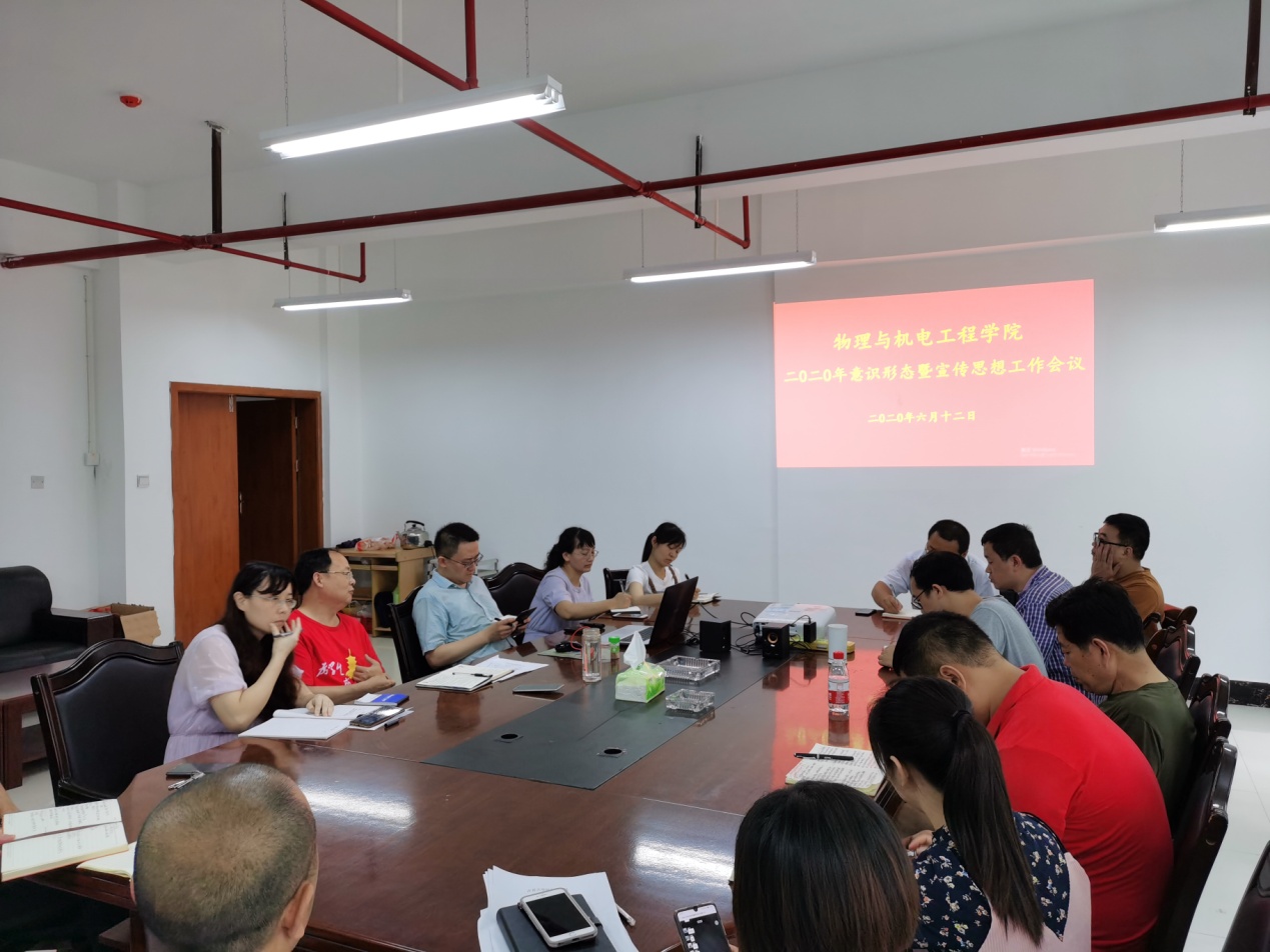 (通讯员:沈言)2020年6月13日上午,我院在工程实训大楼A421小会议室召开会议专题研究了学院2020年意识形态工作暨宣传思想工作。参加会议的有学院领导、学院办公室主任、院学工办主任、各教研室主任及各党支部书记。会议由院党委书记熊文斌主持。