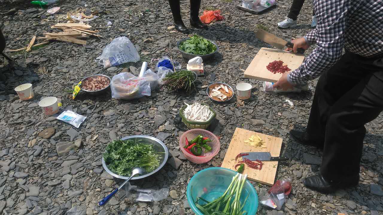 早上8:00,教职工分组采购了各自需要的食材,带齐工会统一购买的野炊用具,10:00兴致勃勃地从砂子坳校区出发,经过大约半小时的车程,来到了吉首市小溪镇。这里群山环绕,一条清澈的小溪穿过山间,溪摊宽阔平整,是一个野炊的绝佳场地。到达目的地之后,每个小组选定自己的场地,马上投入到野炊活动中,支灶、生火、洗菜、切菜、炒菜……不一会儿,在袅袅炊烟中,水煮鱼火锅、羊肉串烧烤、腊肉野菜小炒等各色佳肴纷纷登场,整个溪滩上香气缭绕。开餐时,大家打破了组的界限,你来我往,欢声笑语不断。
