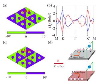 图1. 单层MnBr的贝里曲率分布:(a) 自旋向上和(c) 自旋向下在整个布里渊区范围内的贝里曲率;(b) 沿高对称线的贝里曲率(红色和蓝色线分别表示自旋向上和自旋向下的贝里曲率);(d) 谷层自旋霍尔效应示意图("+"符号表示空穴,向上和向下箭头分别对应自旋向上与自旋向下的载流子)。