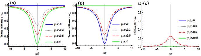 1:透射系数(a)(b)和反射系数(c)随光子入射频率与非线性谐振腔器的本征频率的失谐量的变化。蓝色实线、黑色点划线、红色虚线和绿色实线的参数分别.所有的参数的单位为工。