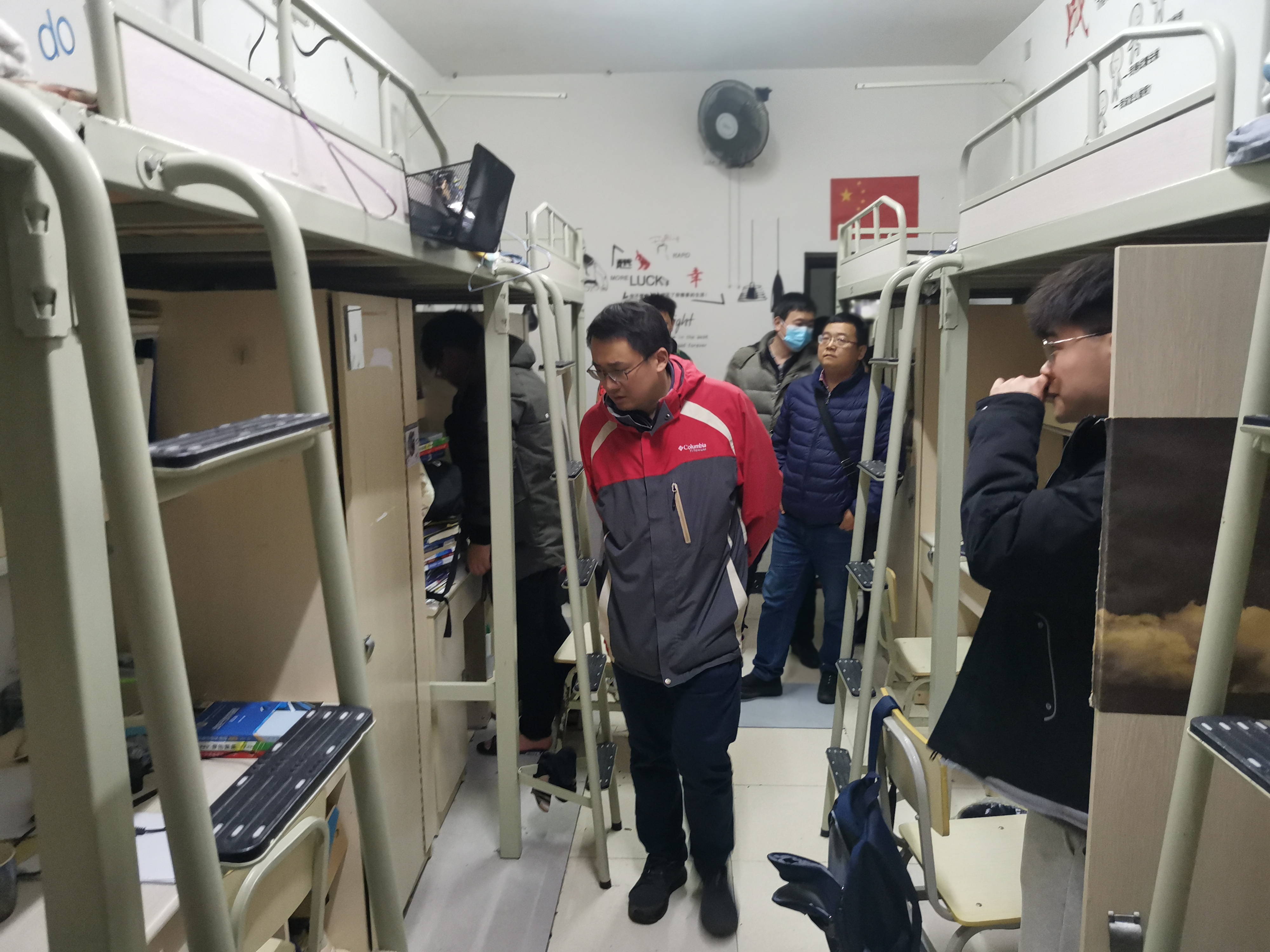 邓科一行走访了我院的学生宿舍,了解了学生返校情况并对学生寝室进行了安全隐患排查。每到一处,领导、老师都亲切地与同学们进行交谈,叮嘱同学们要搞好宿舍卫生,及时调整状态,进入新学期学习。此外,领导、老师还重点排查了宿舍安全隐患,就严禁使用大功率电器和注意人身、财产等安全问题进行了强调,领导、老师对同学们提出的问题也都进行了耐心解答。