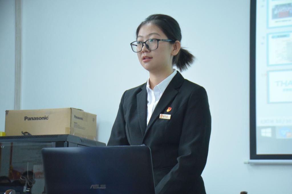 三号辩答选手,来自2016级机械一班的王艺钧,她分别从思想政治、学业成绩、工作经历及社会实践进行了自我展示;