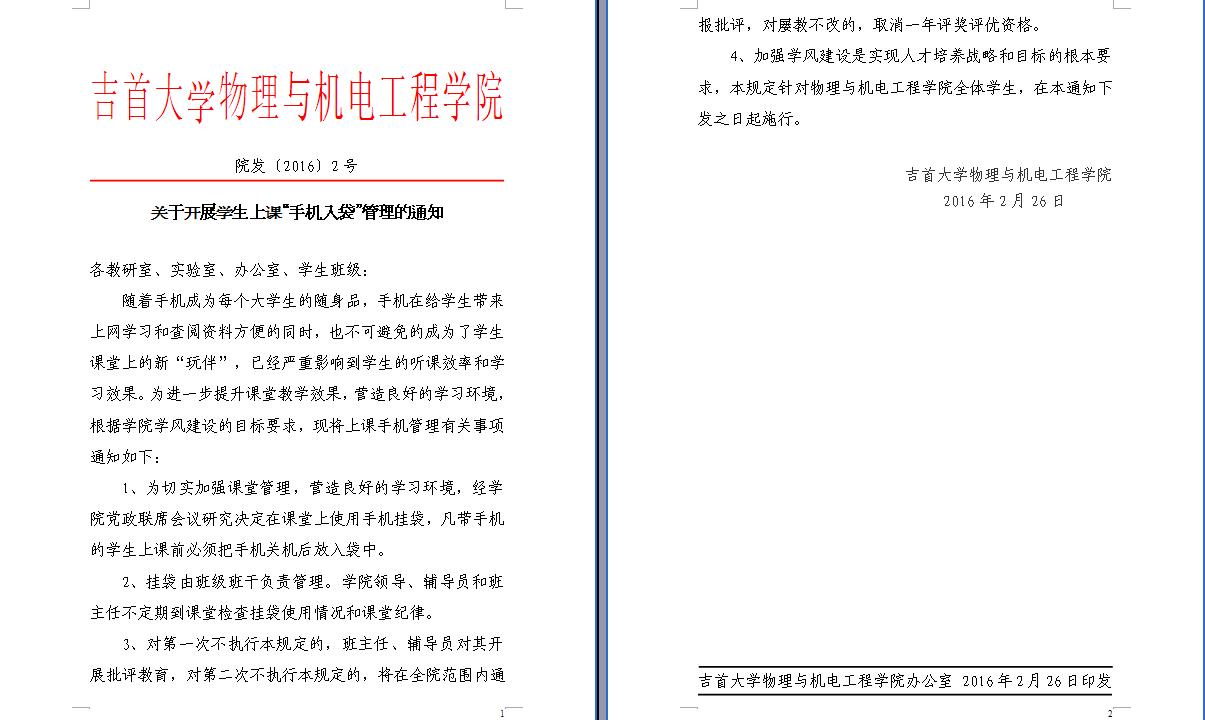 院发[2016]2号--关于开展学生上课“手机入袋”管理的通知