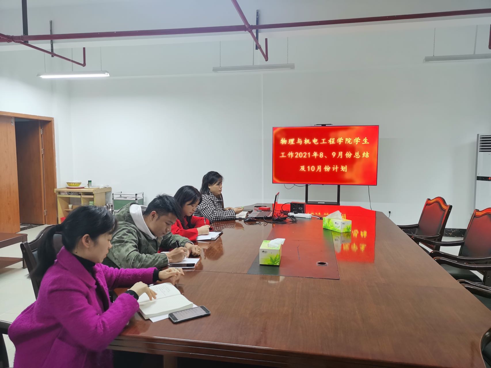 10月22日上午,我院在第十二教学楼A421会议室召开了8、9月学生工作总结暨10月工作计划会议。学院党委副书记许斌、学工办主任朱姗姗、团委副书记谭艳文、辅导员袁强参加会议。