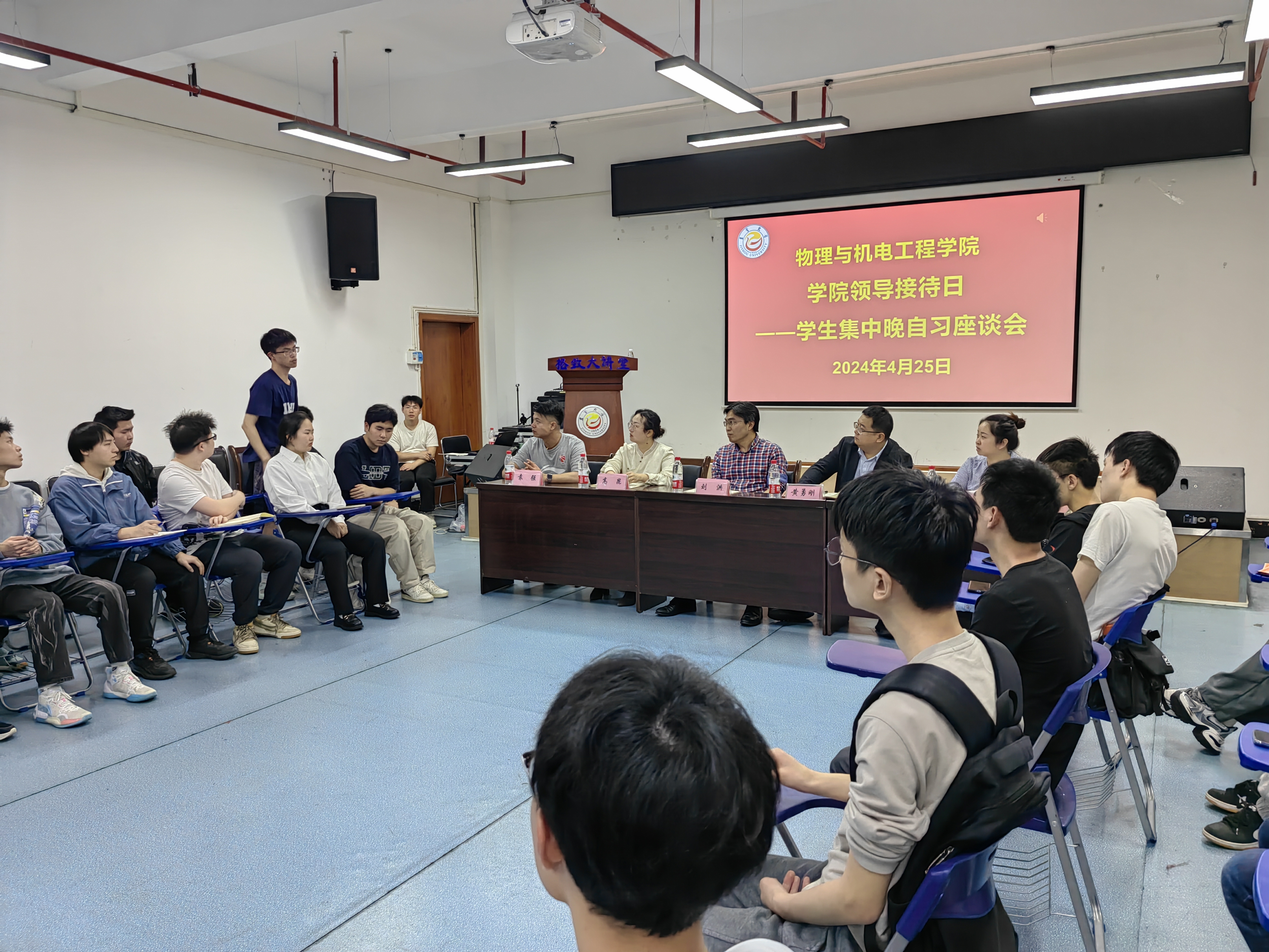 (通讯员唐金金)2024年4月25日,williamhill英国在砂子坳校区工科大楼A101格致大讲堂举行了学院领导接待日——学生集中晚自习座谈会。学院党委书记刘洪、院长黄勇刚、党委副书记高昆、学工办老师、部分朋辈辅导员和学生代表参加本次活动。
