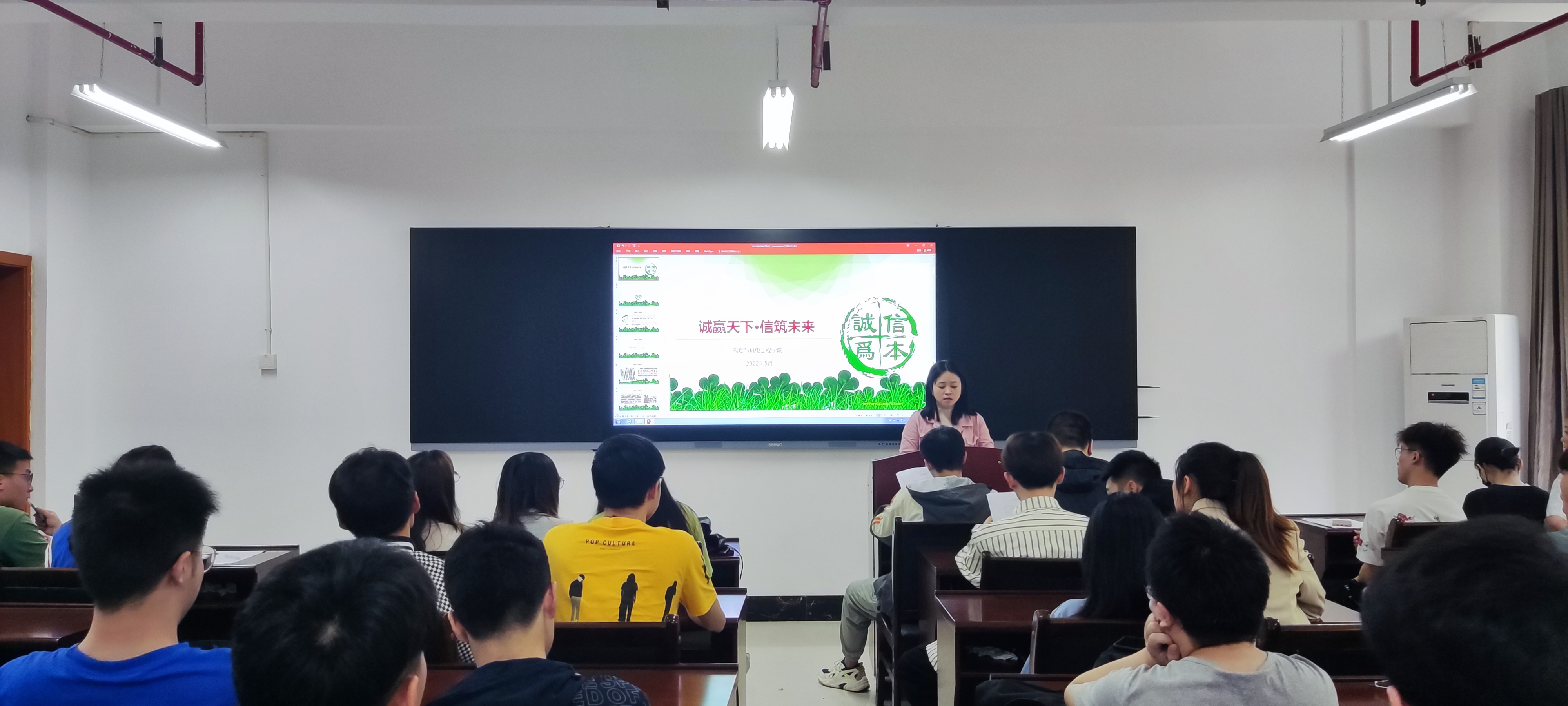 谭老师从何为诚信及其具体表现、大学生常见诚信问题、诚信问题带来的严重后果三个方面进行详细讲述,最后,她希望大家以实际行动做到重信、知信、言信、守信,以诚信换取诚信,以诚信收获成功。