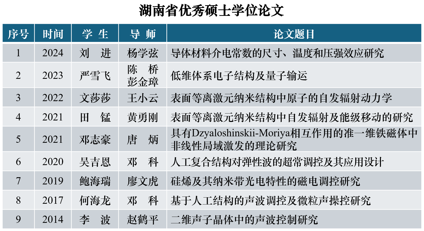 现有硕士生导师45人,其中教授24人,副教授18人,具有博士学位的导师占89 %,共有获全国优秀教师、湖南省芙蓉教学名师、湖南省青年骨干教师、湖南省教学能手、湖南省优秀研究生导师等称号的教师10多名,湖南省优秀研究生导师团队2个,湖南省研究生优秀教学团队各1个,形成了以教授、副教授为核心骨干,老中青相结合并以中青年为主,学历、职称、年龄结构合理的导师队伍。自2014年以来,校内导师主持国自科51项、省厅级项目80项,科研经费2000余万元。学院教师发表学术论文500余篇,近100篇发表于Phys. Rev. Lett.、Phys. Rev. A、Nat. Commun.以及Appl. Phys. Lett.等国际一流期刊。