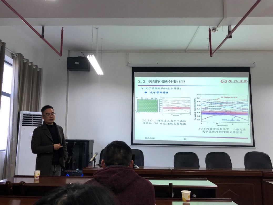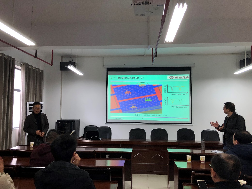 报告过程中,黄利军博士首先给大家介绍硅基光检测传感器的研究背景、结构、制备工艺、测试原理及应用领域;然后针对目前光检测传感器研究热点方面,结合本人研究情况在光检测传感器的探测极限、集成度、谐振峰消光率的提升等方面进行了阐述,并通过理论研究和实验测试将设计的传感器结构用于葡萄糖、甘油浓度的检测传感。测试结果显示,当检测溶液浓度增加时,其传输透射谱谐振峰平移到更高波长,能满足检测传感领域需求。报告结束后,学院师生提出关于本次报告的相关问题与黄利军博士进行交流与讨论。